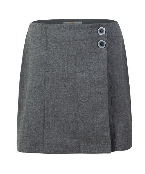 着用時に広がるラップスカートの短所を補正するため、内側上下にシークレットボタンを配置しました。